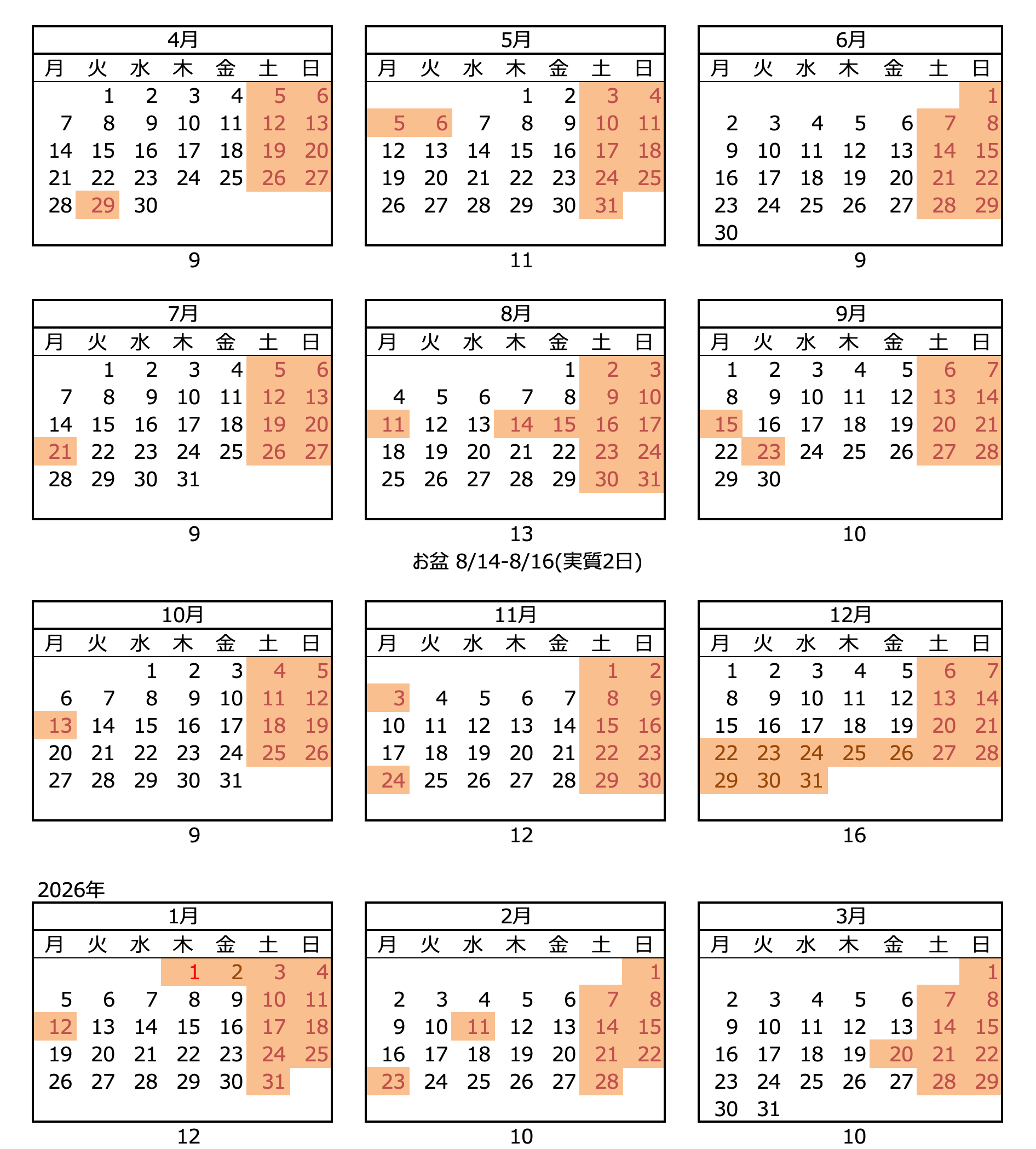 ゴールデンウイーク、夏季、年末年始の休止期間も上記カレンダー通りです。